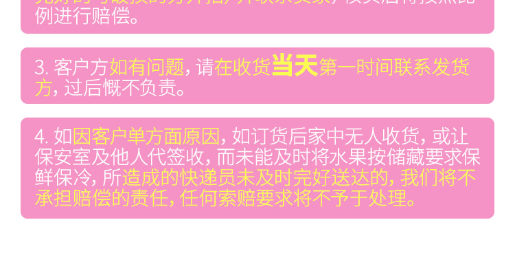 偏远地区加寒冷打包附加费(新疆 西藏 青海 内蒙 甘肃 云南 黑龙江 吉林 辽宁 +10元/kg),新疆只发乌鲁木齐。水果订单接单后,统计订单至果园,周一三五安排发货;过海关后分单贴顺丰快递单,可获得快递单号;由发货至国内签收约7天左右。